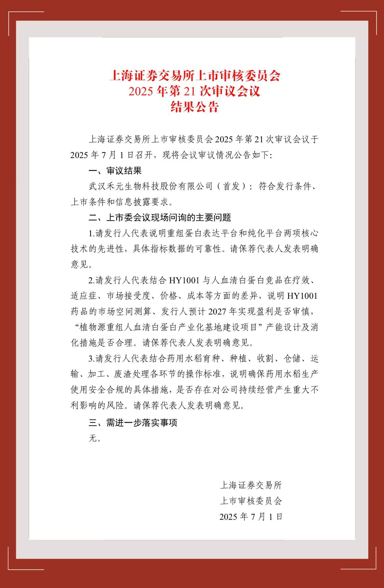 7月1日,上海证券交易所上市审核委员会召开2025年第21次上市审核委员会审议会议,经审议,武汉禾元生物科技有限公司符合发行条件、上市条件和信息披露要求。